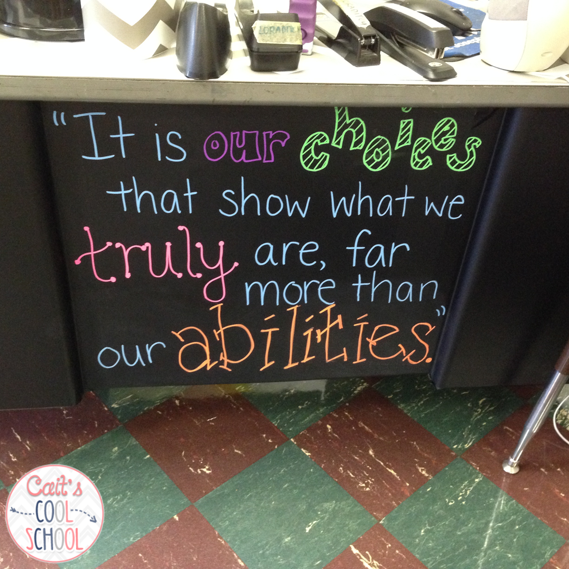 3. I don’t have a cute classroom theme. I have posters, bulletin boards, and decorations, but I don’t have one connecting theme, besides, well- this is 4th grade. Hope you love it! And check out some fun things that Mrs. Veise likes- like my Harry Potter quote on my desk (please ignore our ugly floor).